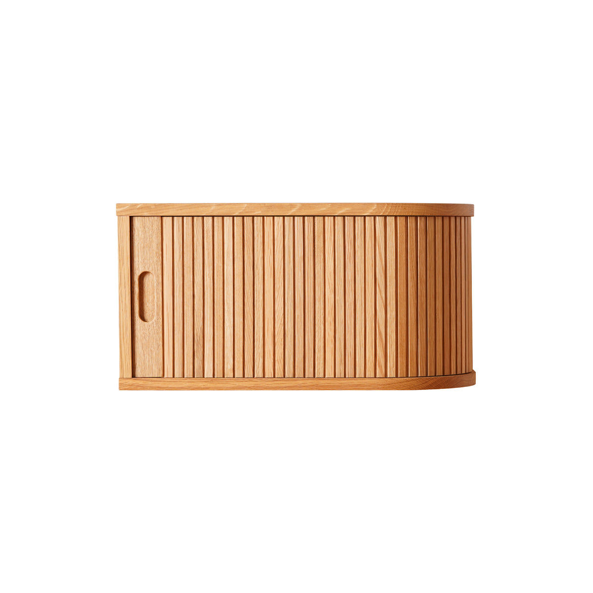 Bedside No. 129, a floating nightstand in solid wood. Attached to the wall but designed to float, maximizing the use of space. Perfect to integrate with a lamp, clock and book in minimal space. Convenient storage behind a side-closing tambour door in solid wood. Proportioned to obtain a very pleasant and functional look. Crafted from solid wood and available in oak and walnut.