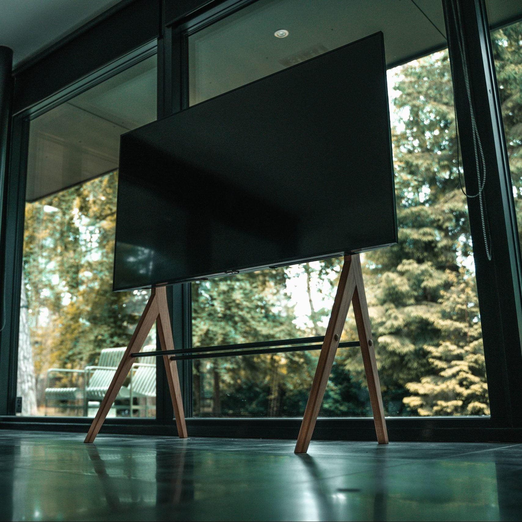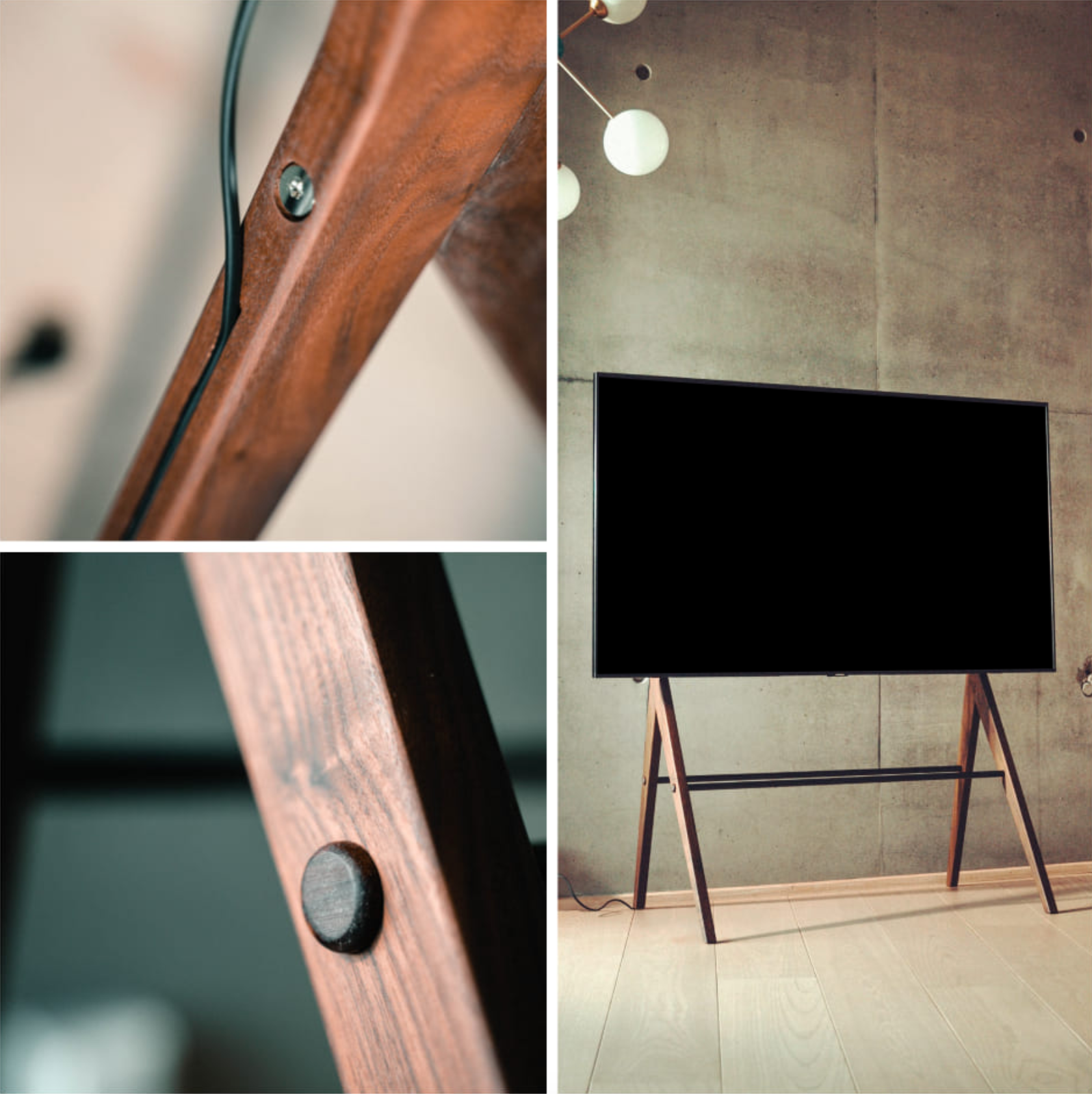 I det ene ben er der en ledningsskjuler, der gør standeren endnu mere stilren, fjerner alle unødvendige indtryk og giver det fritstående møbel det blikfang som det har fortjent.